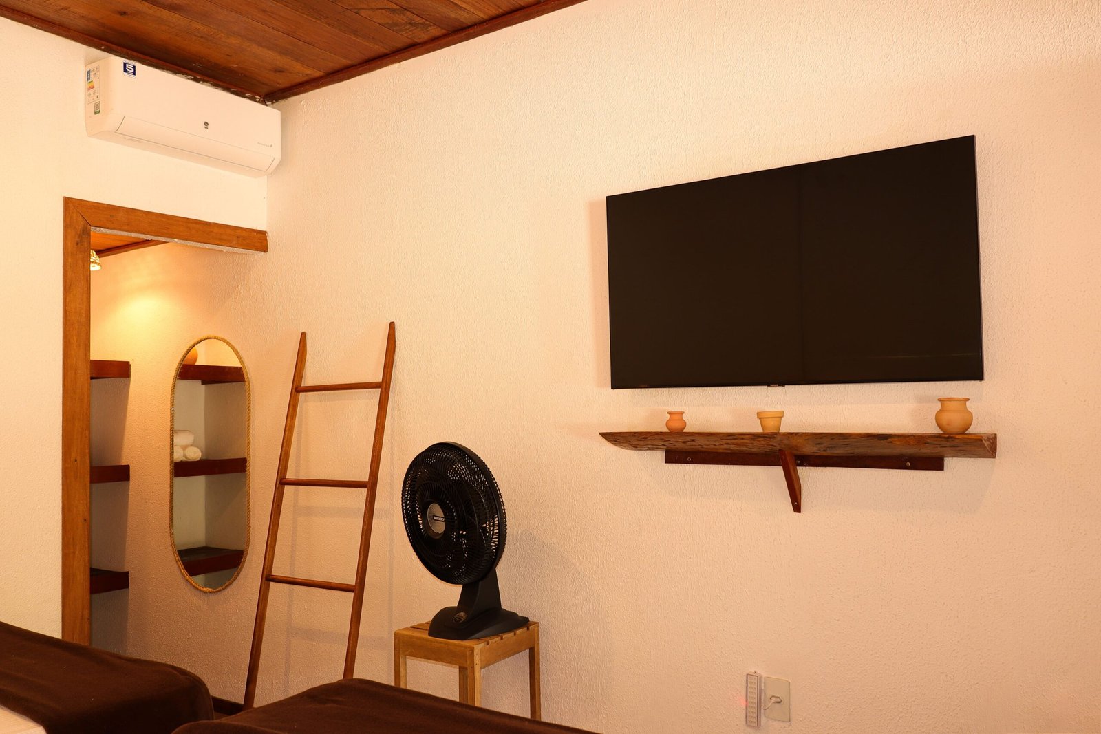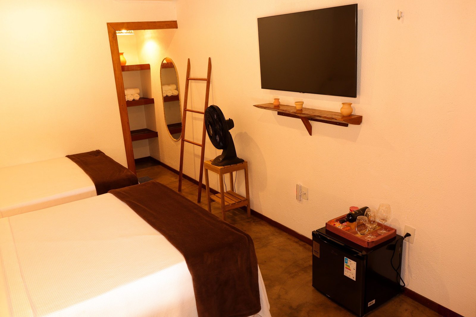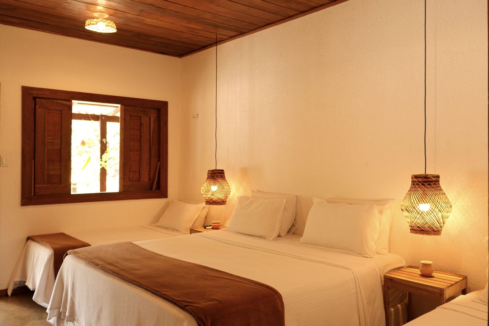 A Suíte Super King combina charme, conforto e amplitude para quem deseja relaxar em meio à natureza de Presidente Figueiredo. Ideal para famílias ou pequenos grupos, oferece um ambiente acolhedor após dias de cachoeiras e aventuras pela floresta, com varanda compartilhada perfeita para momentos de descanso ao som da mata. A suíte acomoda até 4 pessoas e dispõe de 1 cama super king, 2 camas de solteiro, travesseiros hipoalergênicos, ar-condicionado, frigobar, Smart TV 50”, chuveiro elétrico e Wi-Fi com suporte via Starlink, além de varanda com rede para relaxar.